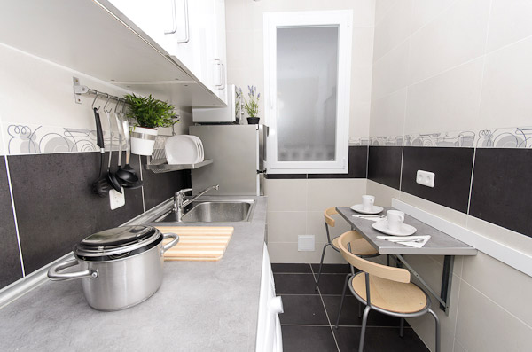 En la fotografía superior se muestra una cocina en la que, lejos de presentarla sólo con los electrodomésticos, se ha decidido mostrar lo bien que encajarían una serie de accesorios básicos: cucharones, espumadera, una olla, una tabla de madera, un par de juegos de desayuno... Con este tipo de detalles en tus fotografías será mucho más fácil presentar el piso de forma atractiva a los posibles interesados. La inclusión de detalles en tus fotografías te permitirá lograr una mejor impresión en quien observe la fotografía.